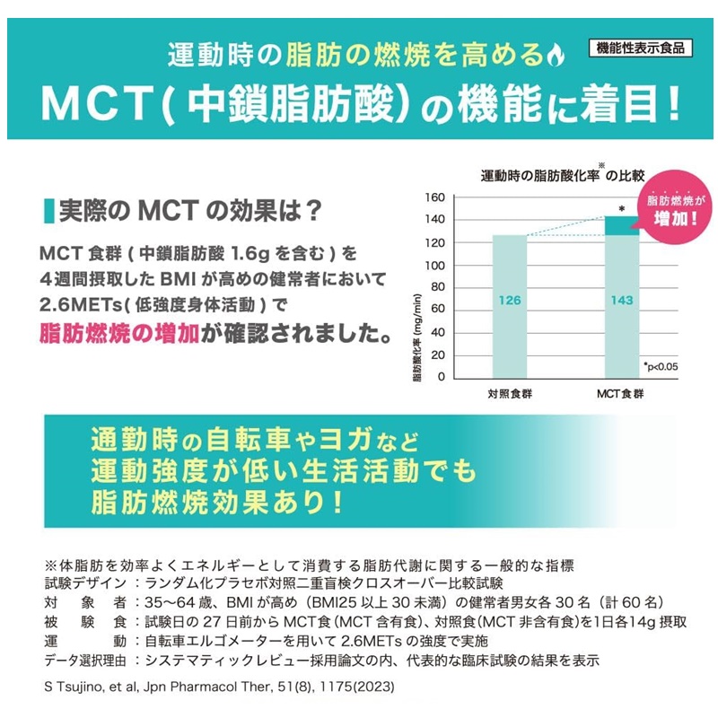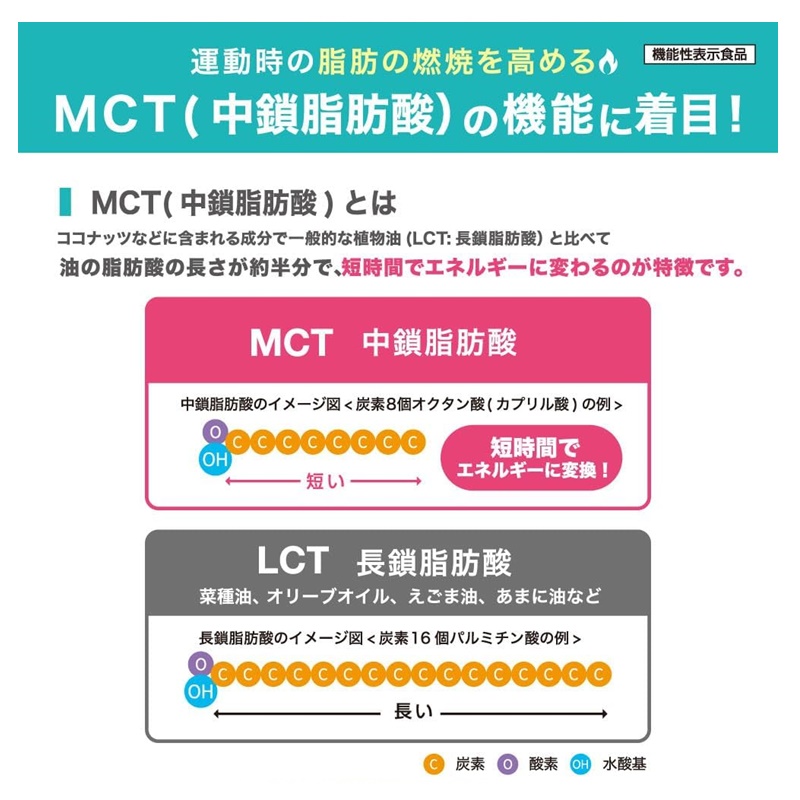 機能性関与成分の中鎖脂肪酸(オクタン酸・デカン酸)は運動時の脂肪の燃焼を高めることが報告されています。