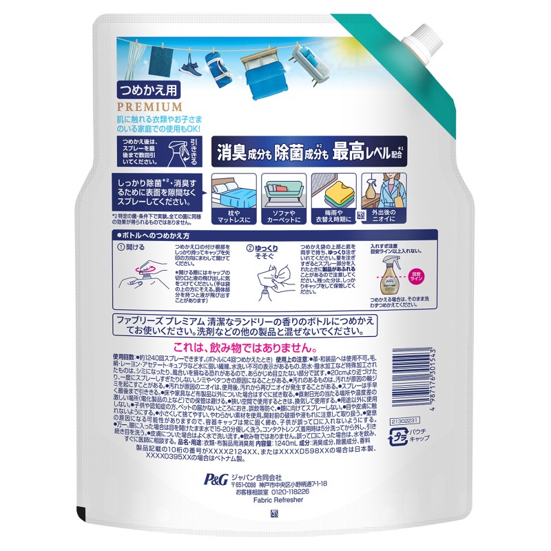 ファブリーズプレミアム 消臭+除菌 清潔なランドリーの香り 詰替え用 超特大 1240ml
