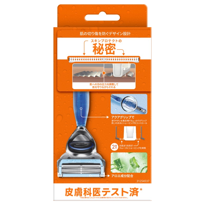 ●スキンプロテクトの秘密…肌への刃の圧力を調整して肌を守りながらそれるアクアグリップで滑りやすい