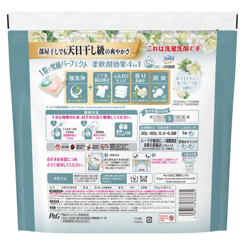 シエチレンアルキルエーテル)、安定化剤(グリセリン、プロピレングリコール)、香料、分散剤、金属封鎖剤、洗浄助剤、酵素、柔