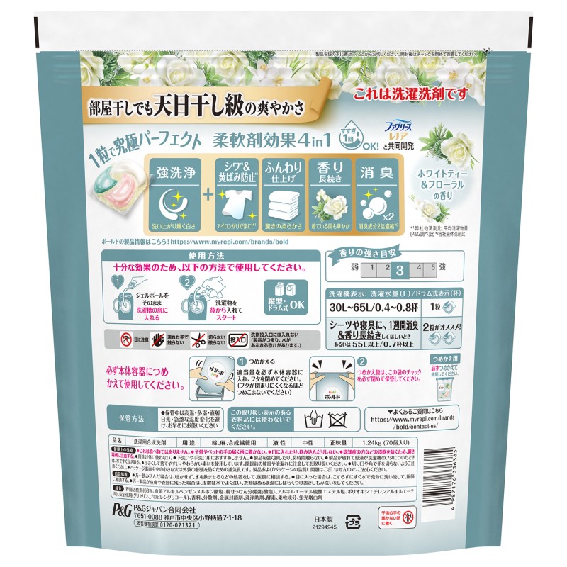 エチレンアルキルエーテル)、安定化剤(グリセリン、プロピレングリコール)、香料、分散剤、金属封鎖剤、洗浄助剤、酵素、柔軟