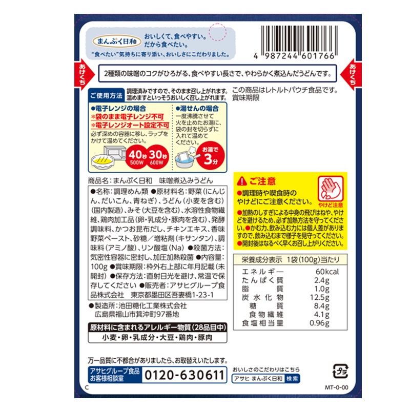 鶏肉、にんじん、だいこん、青ねぎ、食べやす長さのうどんを、2種類の味噌で、コクのある味わいにやわらかく煮込みました。