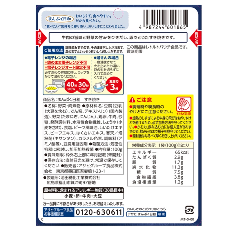 牛肉、豆腐、2種の野菜、たまご入り。牛肉の旨味と野菜の甘みをひきだし、卵でとじたすき焼きです。