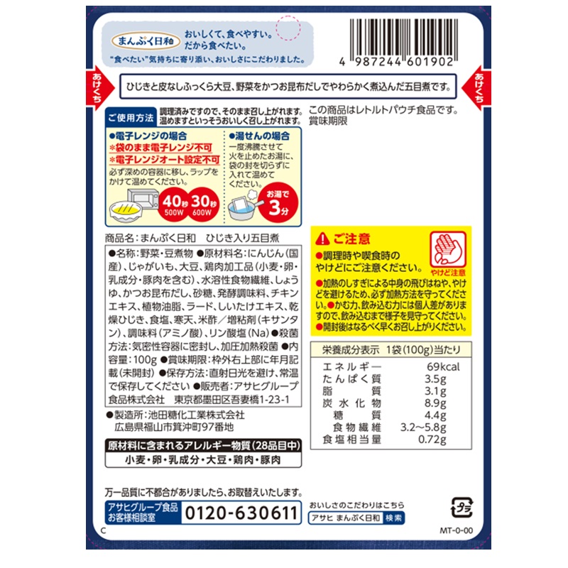 ひじき、皮なしふっくら大豆、鶏肉、にんじん、じゃがいも入り。