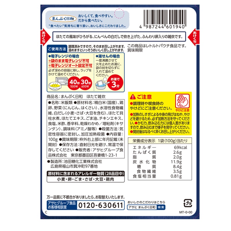 ほたて貝柱、わかめ、にんじん、はくさい、たまご入り。ほたての風味がひろがる、