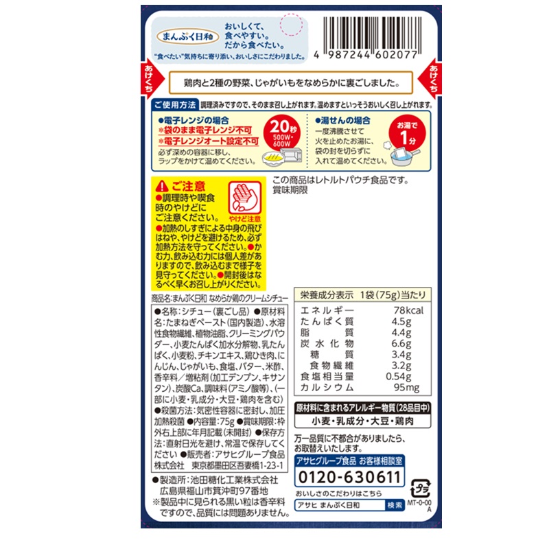 鶏肉とたまねぎ、にんじん、じゃがいもをなめらかに裏ごしして、やさしい味わいに仕上げました。