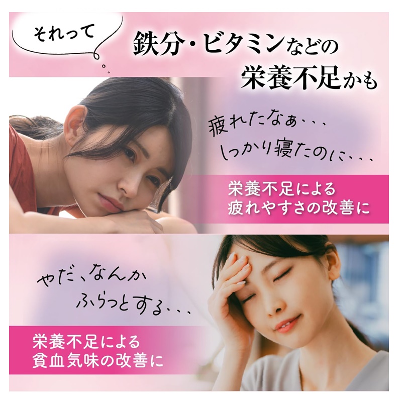 女性に不足しがちな鉄分をはじめ、ビタミンB1・B2・B6、マグネシウム、カルシウム、ローヤルゼリー、タウリンを配合し、栄