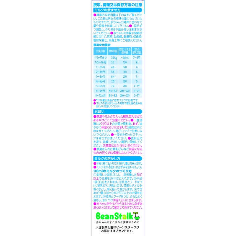 ●一度沸騰した70℃以上のお湯で調乳後、必ず、速やかに体温くらいにさまして2時間以内に飲ませてください。
