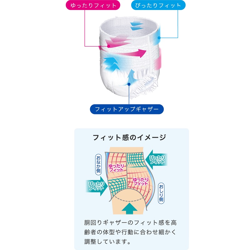 ●フィットアップギャザーが吸収体を押し上げ、尿道口からズレずに密着します。