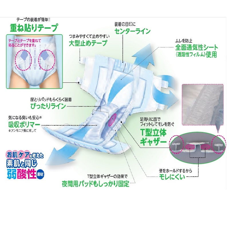 面でフィットしてモレを防ぐT型立体ギャザー。気になる臭いを抑える消臭ポリマー使用。