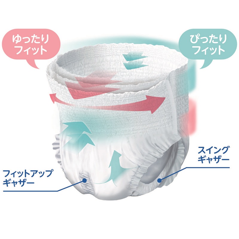 ●スイングギャザーはパンツをはく際の足の動きを妨げにくく、ギャザーに引っかかることによる転倒防止にもつながります。