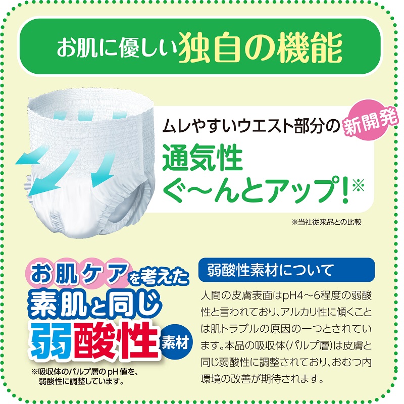 ●お肌ケアを考えた素肌と同じ弱酸性素材採用(吸収体のパルプ層のPH値を弱酸性に調整しています)。