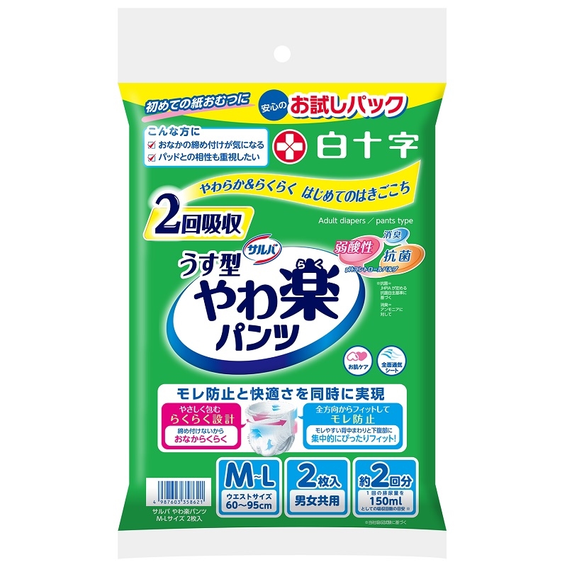 通気性にすぐれたうす型約2回分(約300ml)吸収のパンツタイプ。