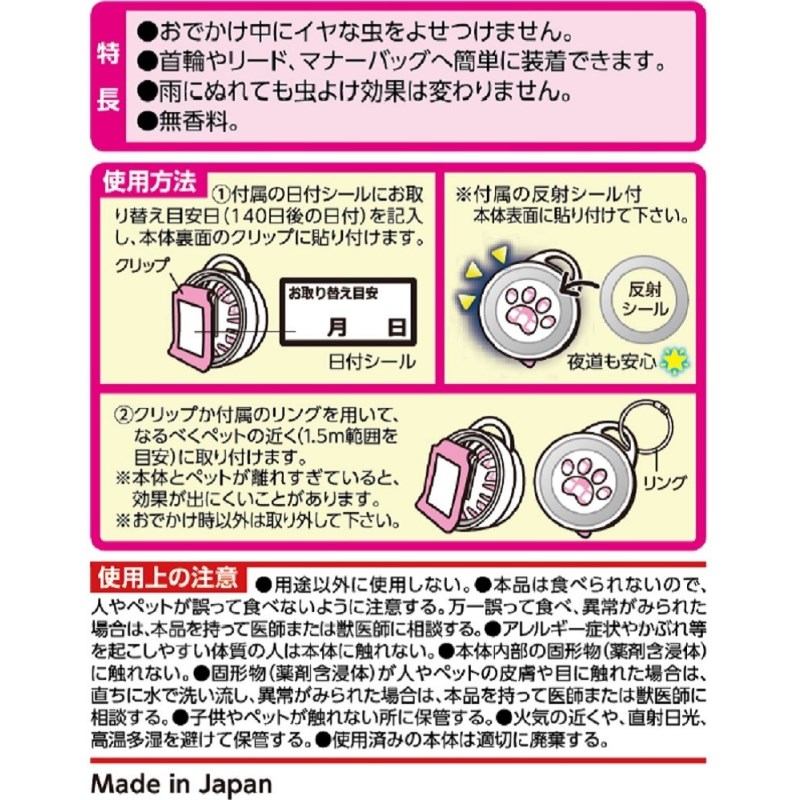 ・首輪やリード、マナーバッグへ簡単に装着できるお出かけ用の虫よけです。