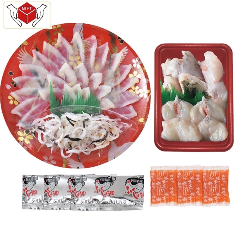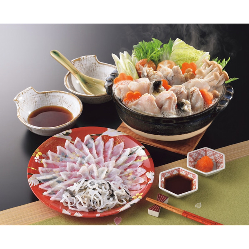 とらふぐ刺身(22cm皿)40g、とらふぐ皮20g、とらふぐちり(切身、アラ)200g、ふく醤油30ml×3、