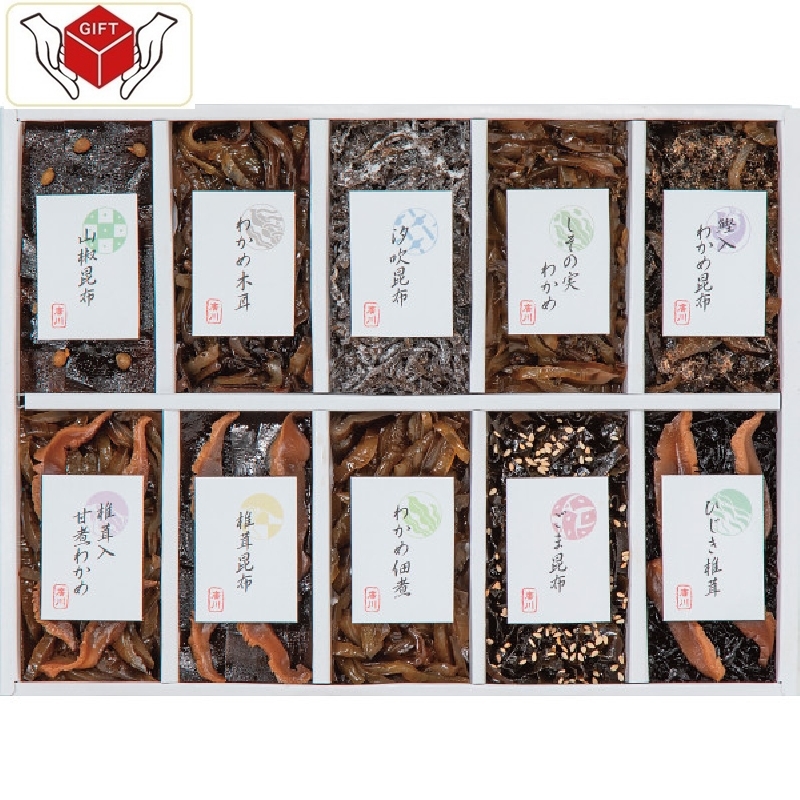ごま昆布・椎茸昆布・しその実わかめ・山椒昆布・ひじき椎茸・わかめ佃煮・椎茸入甘煮わかめ 各45g
