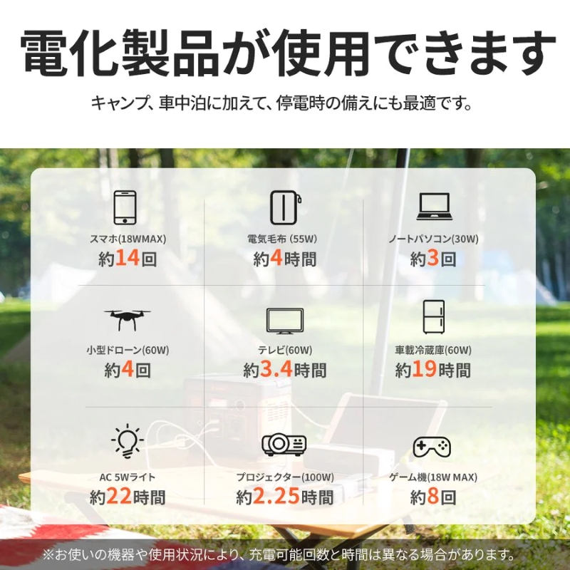 さらにノートPCなら約3回、テレビは4時間、扇風機なら9時間使用できるため、
