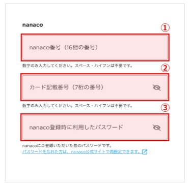 nanaco番号(16桁の番号/ハイフンなし)を入力します。