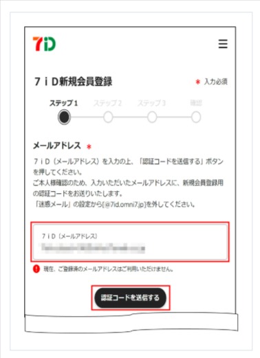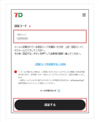 - 認証コードは10分間有効です。認証コードが無効になった場合はお手数ですが「7iD新規会員登録」画面から再度お手続きをお願いします。