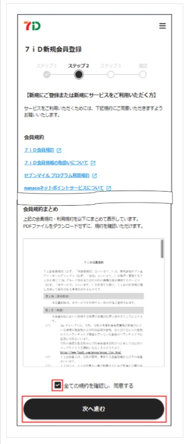 7iDをご利用いただくためのすべての規約をご確認、同意いただきましたら「全ての規約を確認し、同意する」にチェックを入れ「次へ進む」を押下します。