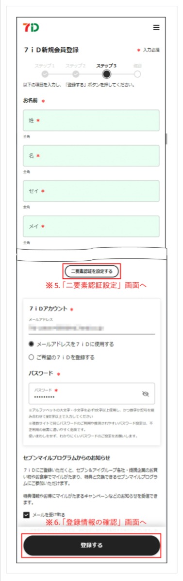 4. 「7iD新規会員登録」画面にてサービスをご利用いただくにあたって必要な情報を入力し「登録する」を押下します