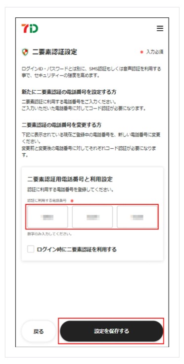 「二要素認証設定」画面にて認証に利用する電話番号と二要素認証利用設定を登録し「設定を保存する」を押下します。