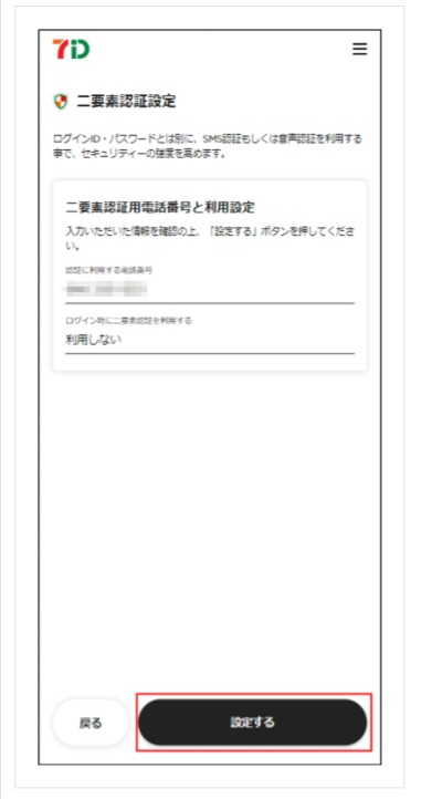 5-1. 「二要素認証用電話番号」と「ログイン時の二要素認証の利用する/しない」をご確認のうえ「設定する」を押下します