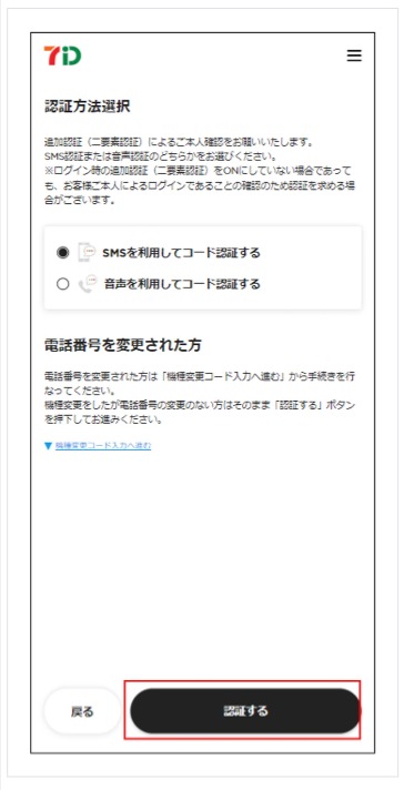 5-2. 「認証方法選択」画面にて認証コードの受取り方法を「SMS」「音声」のいずれかにチェックを入れ「認証する」を押下します