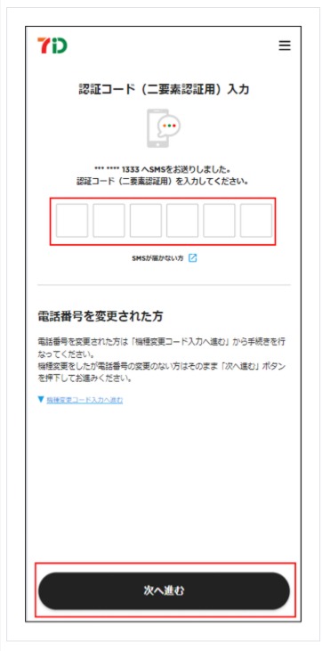 5-3. 「認証コード(二要素認証)入力」画面にて「SMS」または「音声」のいずれかで受け取った認証コードを入力し「次へ進む」を押下します