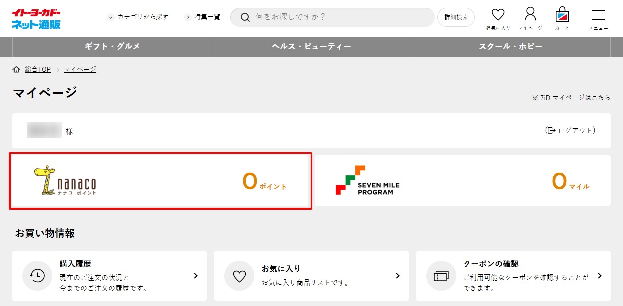 1.マイページのお買い物情報の「nanacoポイント・セブンマイル」を選択