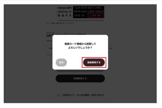 4. 現在登録されているnanacoカード/モバイルの情報を確認し、「登録削除する」を選択