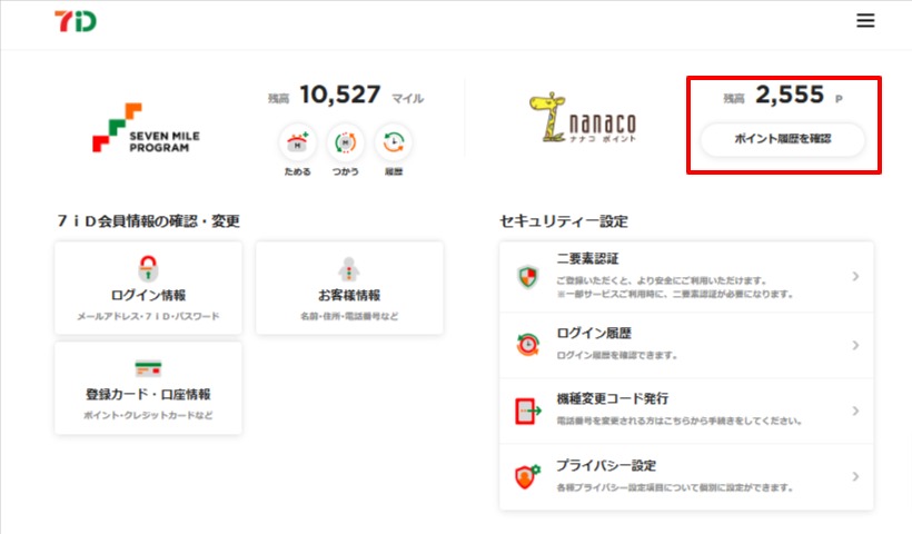 7iDアカウントサービス画面に移り、nanacoポイント残高が表示されます。