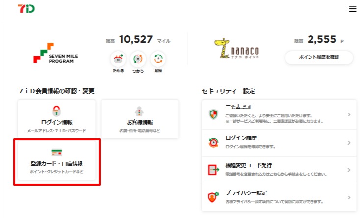 7iDアカウントサービス画面に移りますので、「登録カード・口座情報」を押下します