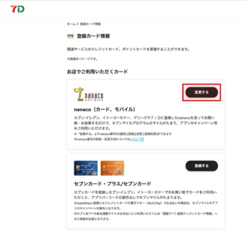 3. 登録カード情報画面で、nanacoポイントサービスの「変更する」を選択