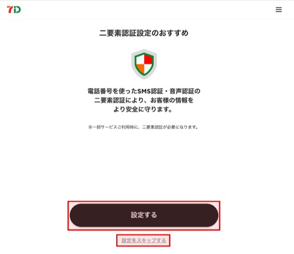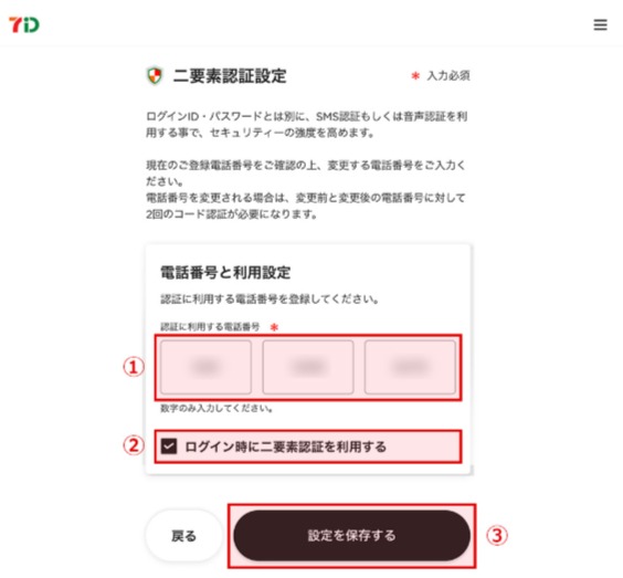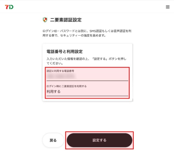 6. 二要素認証設定画面で「電話番号」と「利用設定」を登録