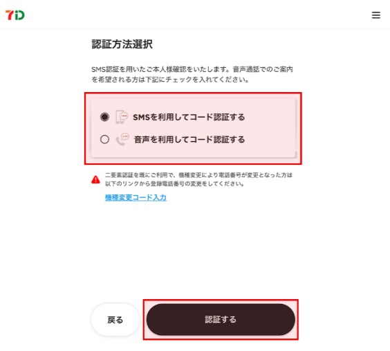 「認証方法選択」画面にて認証コードの受取り方法を「SMS」「音声」のいずれかにチェックを入れ「認証する」を押下します。