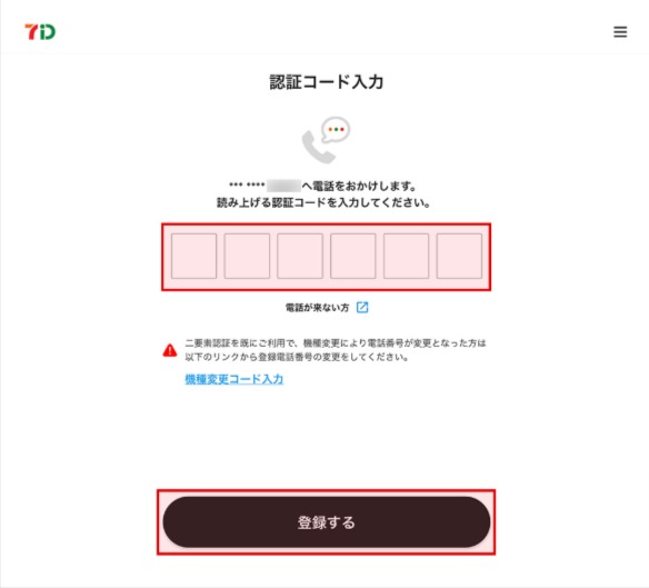 認証コード入力画面にて「SMS」または「音声」のいずれかで受け取った認証コードを入力し、「登録する」を押下します。