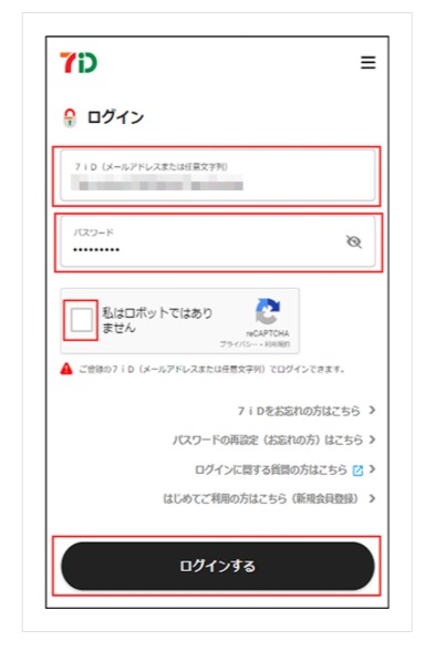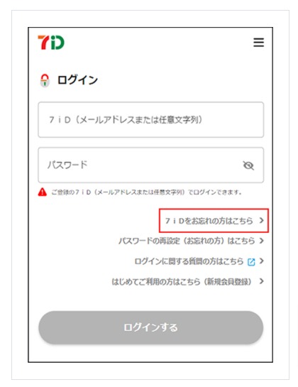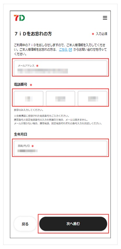 「7iDをお忘れの方」画面へ遷移します。ご登録の「メールアドレス」「電話番号」「生年月日」を入力し「次へ進む」を押下します。