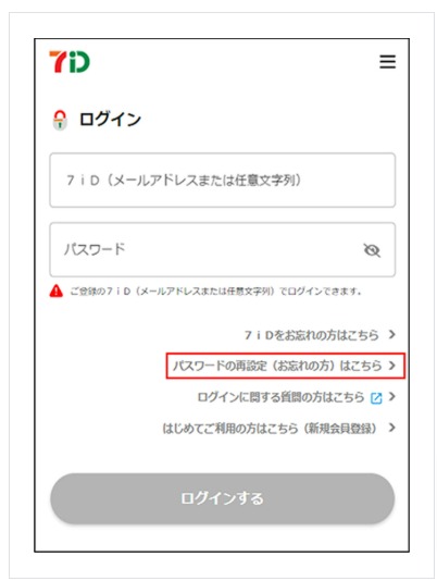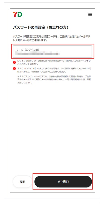 「パスワードの再設定(お忘れの方)」画面にてご登録の7iD(メールアドレスまたは任意の文字列)を入力し、「次へ進む」を押下します。