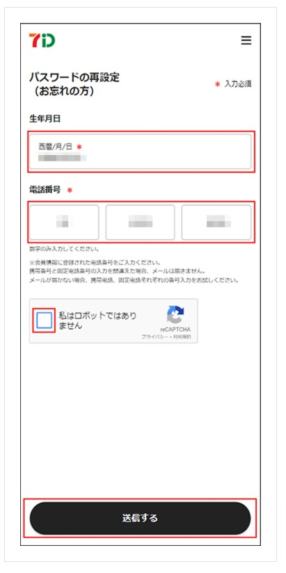 「パスワードの再設定(お忘れの方)」に遷移します。ご登録の生年月日、電話番号を入力して「送信する」を押下します。