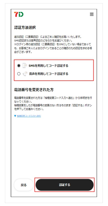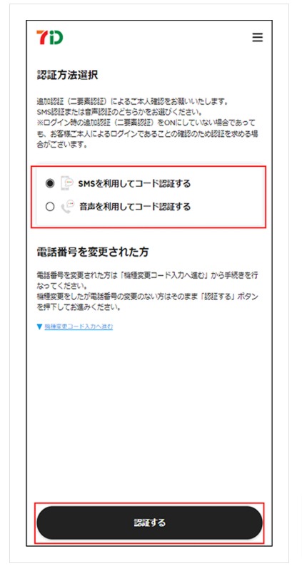 「認証方法選択」画面にて認証コードの受取り方法を「SMS」「音声」のいずれかにチェックを入れ「認証する」を押下します。