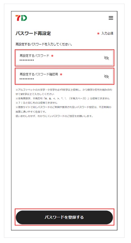 8.「パスワード再設定」画面に遷移します。