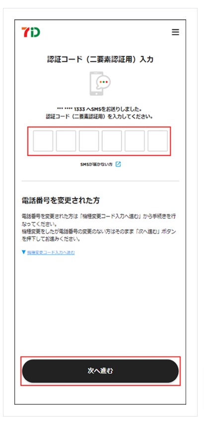 「認証コード(二要素認証用)入力」画面にて「SMS」または「音声」のいずれかで受け取った認証コード(二要素認証用)を入力し「次へ進む」を押下します。