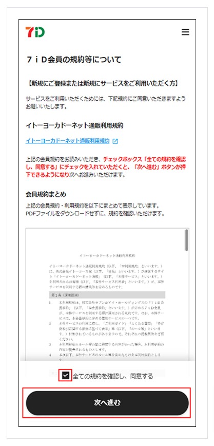 7iDの会員の規約等についてが表示される場合、各種規約等を確認後、「全ての規約を確認し、同意する」にチェックを入れて、「次へ進む」を押下します。