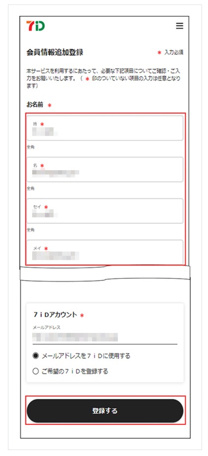 「会員情報追加登録」画面が表示される場合、お客様情報の追加登録・確認後「登録する」を押下します。