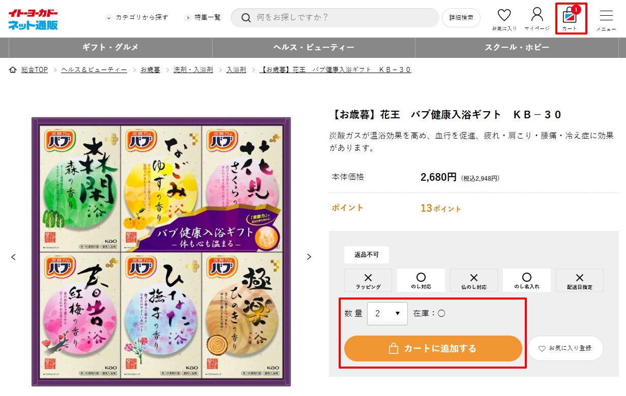 ギフト用に注文したい商品を選び、「カートに入れる」を押します。