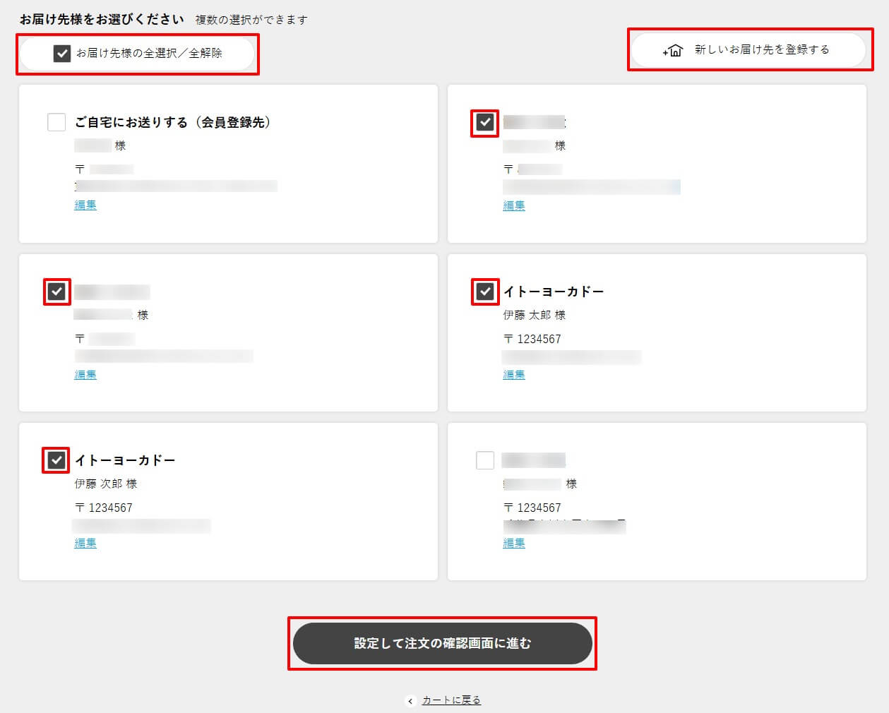 登録されているお届け先がすべて表示されていますので、送付対象のお届け先にチェックを入れ、「設定して注文画面に進む」を押します。