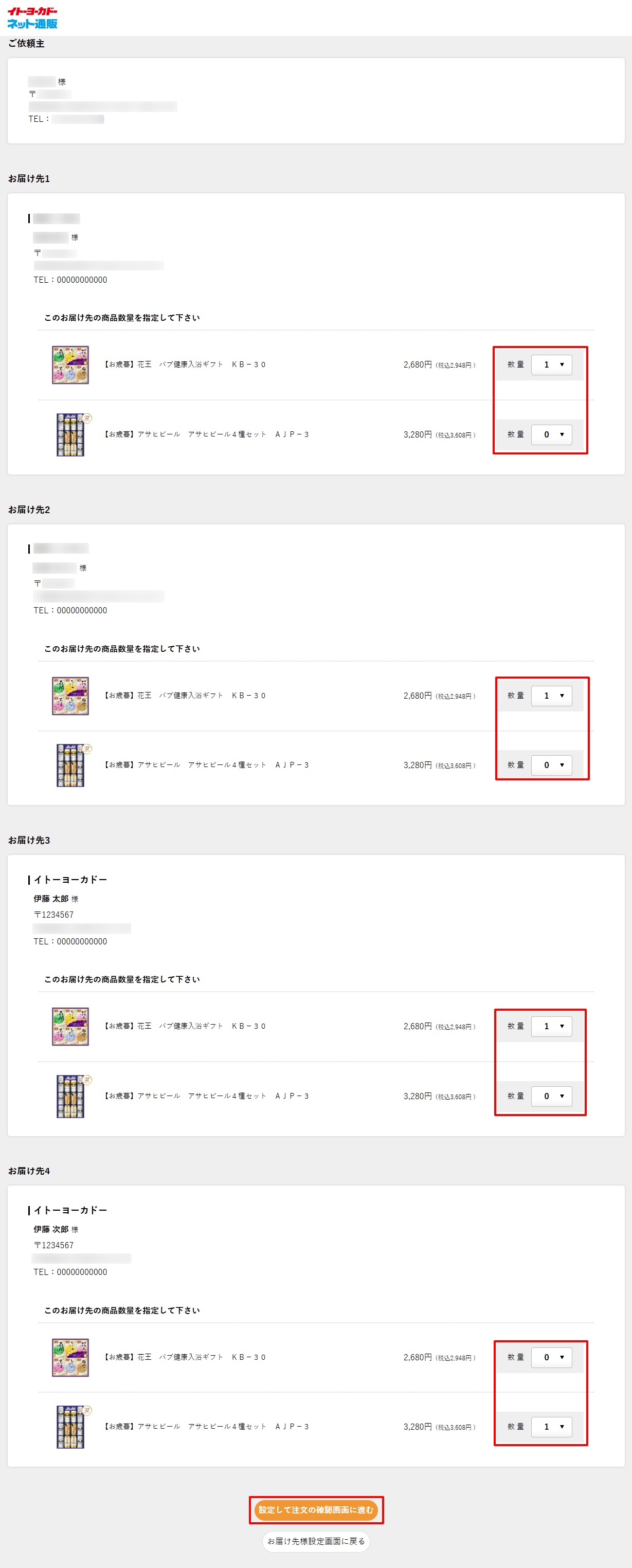 カートに入れた商品がすべてのお届け先に表示されていますので、数量設定し「設定して注文の確認画面に進む」を押します。