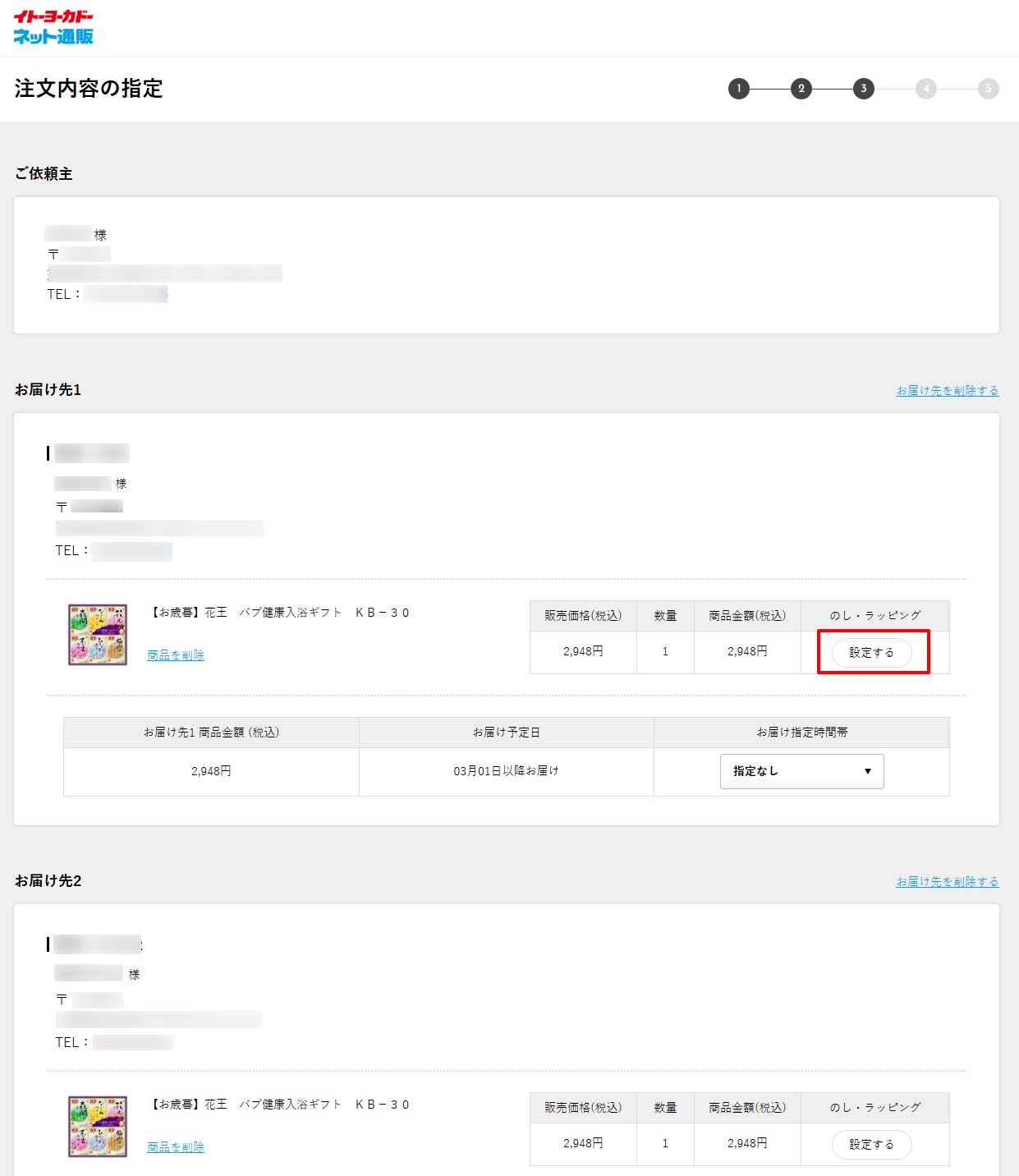 お届け先を1件選び、のしラッピングの「設定する」ボタンを押します。