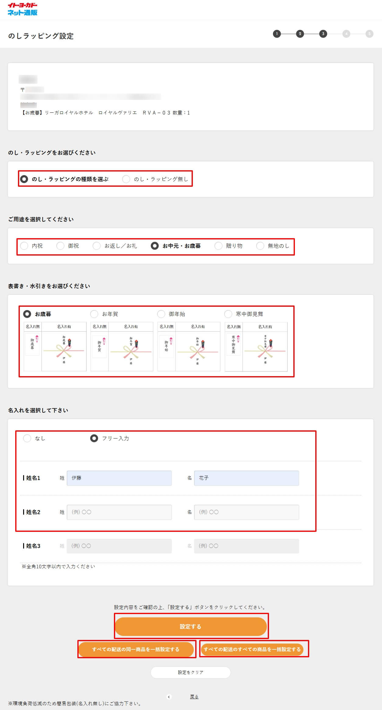 のしラッピング有無、用途、表書き、名入れを順に設定していきます。